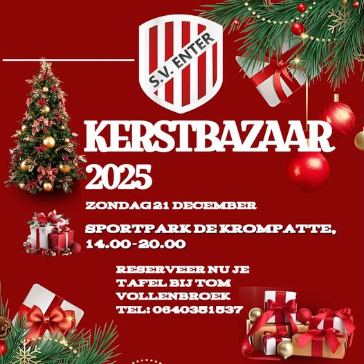 Op zondag 21 december zal de Krompatte weer het decor vormen voor de welbekende Kerstbazaar. Het oude vertrouwde concept met een loterij, schijt-je-rijk en uiteraard een bezoek van de kerstman. Reserveer je tafel direct bij Tom Vollenbroek! (06-40351537)