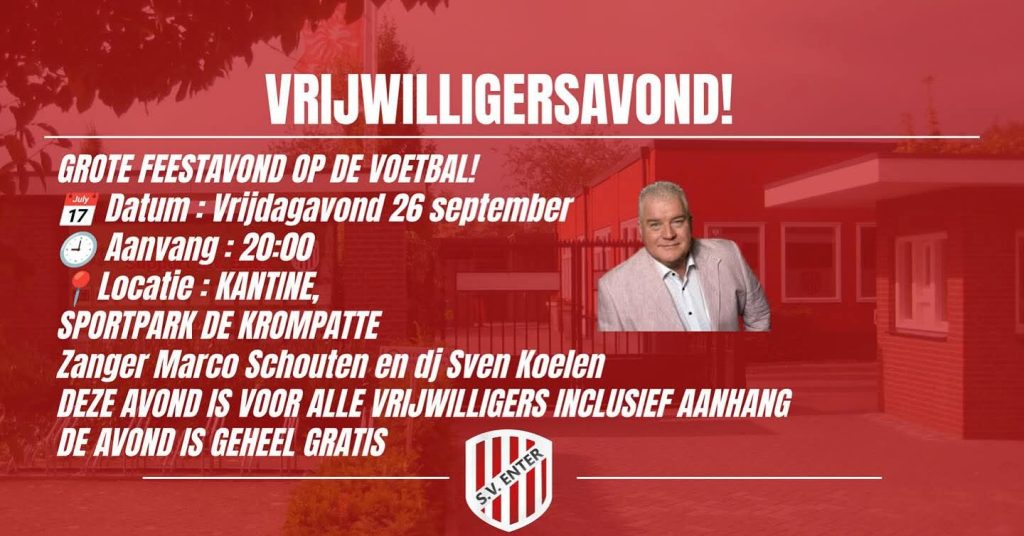 Laatste nieuws Uitnodiging voor alle SV Enter vrijwilligers! 25 juli 2025 Posted by Martin Asbroek 25 jul Hopelijk zien we jullie op 26 september.